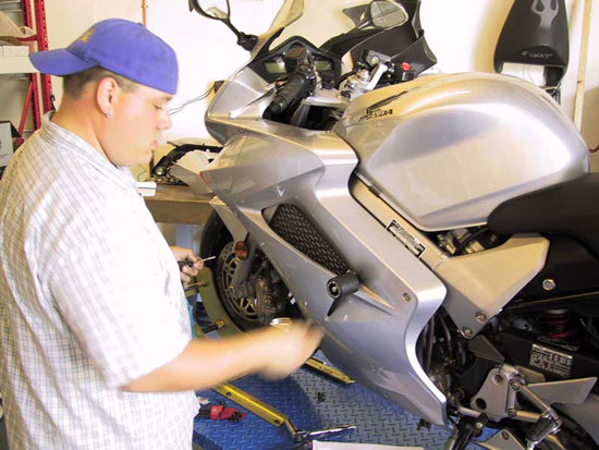 Bagel finishing up a set of frame sliders on an '03 VFR.